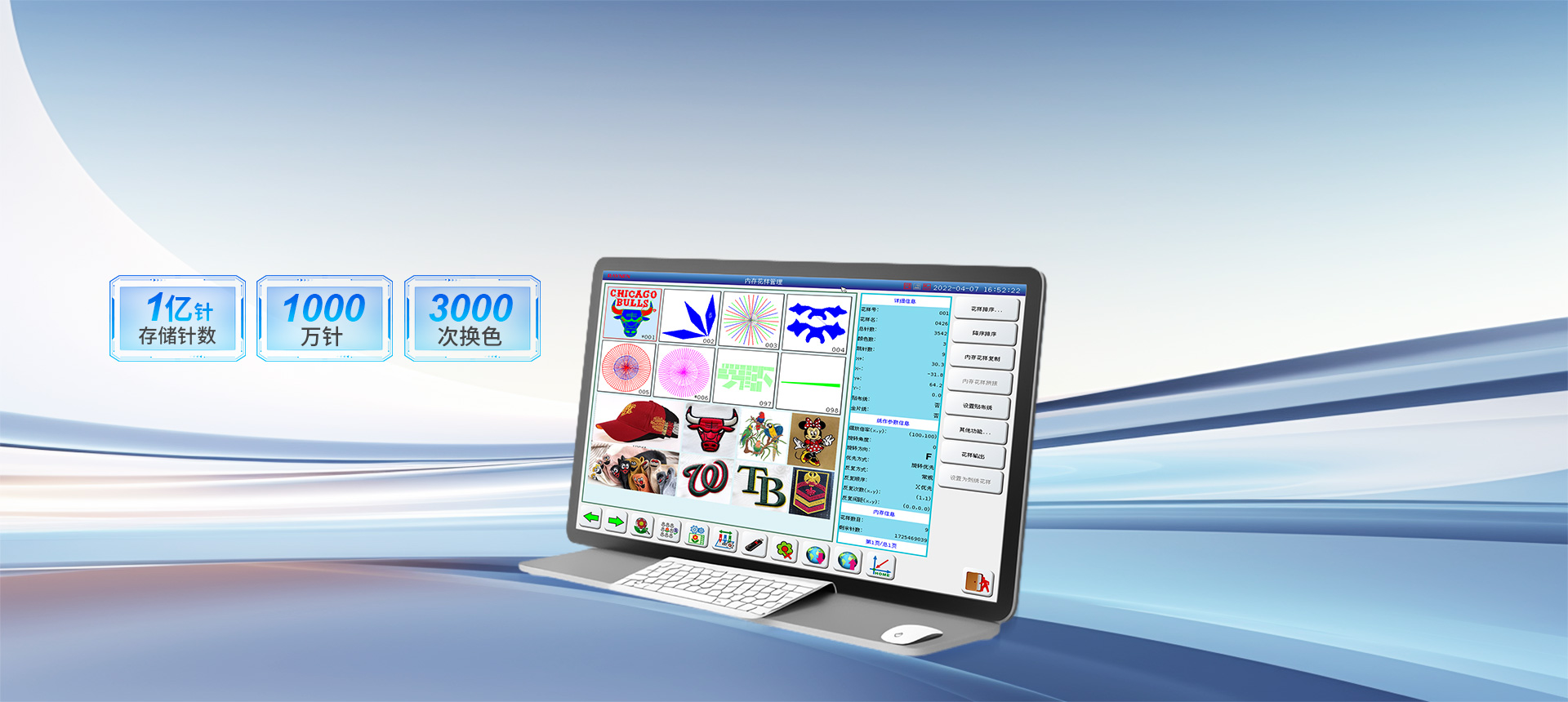 存儲(chǔ)針數(shù)達(dá)1億針,單個(gè)花樣可達(dá)1000萬(wàn)針、3000次換色,滿足復(fù)雜花樣設(shè)計(jì)需求