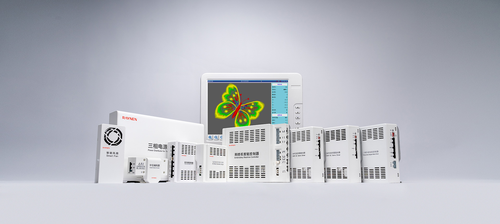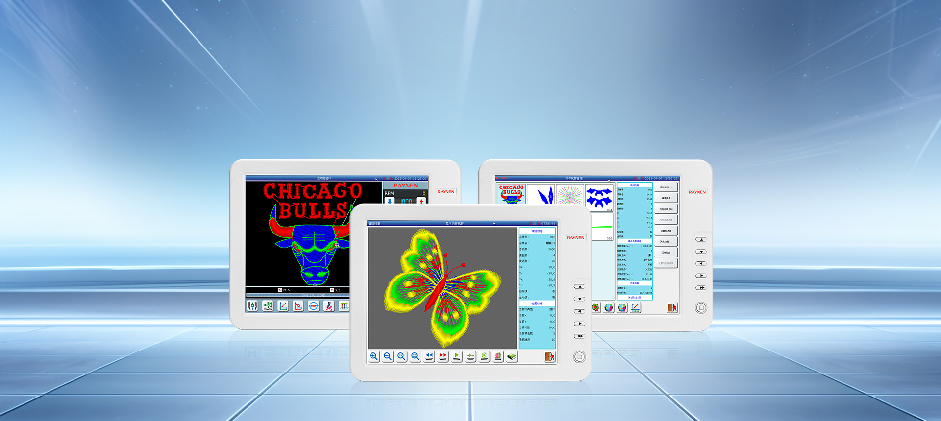 RM系列多頭毛巾繡是屬于一種立體的多工藝刺繡,電控系統(tǒng)通過(guò)毛巾主軸M,XY平面框架、D針?lè)较蜉S、H環(huán)梭軸、S松線軸及T換色軸的6-7個(gè)軸綜合控制的數(shù)字控制系統(tǒng)來(lái)完成各種各樣花版圖形的鏈?zhǔn)矫砝C作。在服裝皮革鞋帽等面料上產(chǎn)生出花樣絢麗、立體感強(qiáng)、邊角清晰的繡品。該產(chǎn)品系統(tǒng)嵌入了多種精密加工技術(shù),包括:運(yùn)動(dòng)軌跡的跟蹤與控制,花版的綜合顯示管理與預(yù)處理,系統(tǒng)多信息融合的協(xié)調(diào)控制,各種機(jī)械部件的優(yōu)化驅(qū)動(dòng),管控一體化的調(diào)度等。